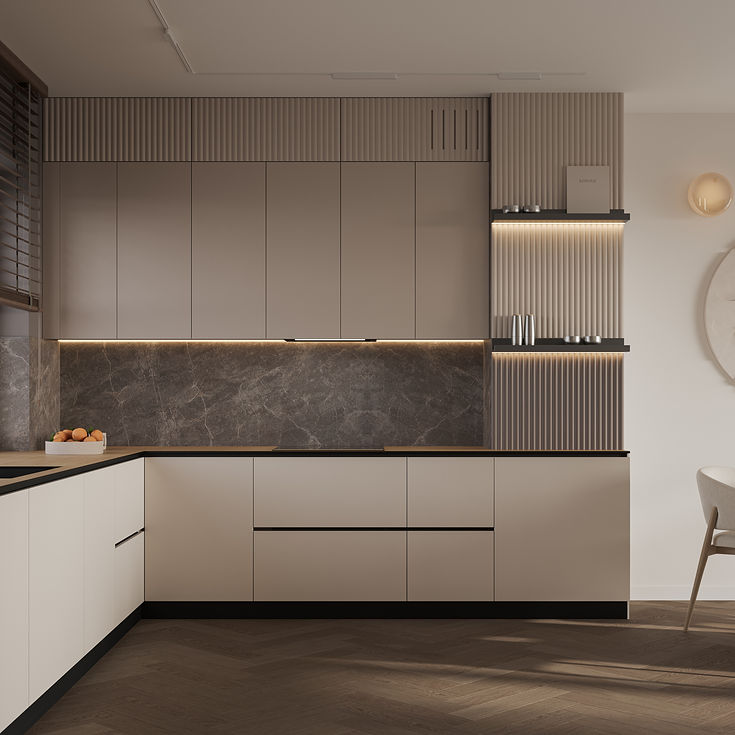 Интерьер построен на насыщенной, но сбалансированной палитре: глубокие оттенки дерева переплетаются между собой, терракота расставляет акценты, зелёные вкрапления добавляют ощущение свежести. Колористика дополнена выразительной игрой фактур — от гладких до структурных, от монохромных до мягко переходящих поверхностей.