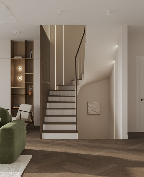 Площадь позволила нам добавить не только ключевые функциональные зоны, но и особые, уютные места, которые в небольших интерьерах часто приходится исключать: пространства для чтения, уголки для уединения, продуманные и вместительные системы хранения.
