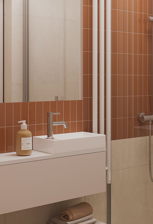 Интерьер выстроен на тактильности и природных материалах — дерево, камень, мягкий рассеянный свет, уют во всём. Цветовая палитра играет важную роль: фисташковая кухня, сочный терракотовый диван в гостиной, розово-зелёные акценты в детской создают живое, но сбалансированное настроение.